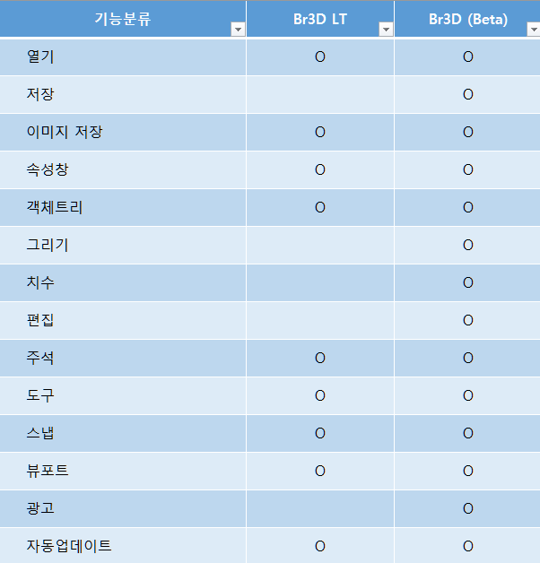 다양한 포멧의 3D 파일을 지원합니다. 읽기 : DWG, DXF, IFC, IFCZIP, STL, STEP, STP, OBJ, LAS, JT, 3DS, IGES, IGS 쓰기 : DWG, HTML, STEP, STP, STL, IGES, IGS, PRC, XML 마우스 동작 뷰 회전 : Control 키 + 마우스 휠 버튼 + 마우스 이동 Pan : 마우스 휠 버튼 + 마우스 이동 편의 기능 다른이름으로 저장 쓰기 가능한 포멧으로 저장합니다. 이미지 저장 현재 화면을 이미지 파일로 저장합니다. 객체 스냅 주석 작성할때 동작 주석 작성 좌표 측정 거리 측정 메모 작성 멀티 뷰 단일 뷰 1×1 1×2 2×2 시점 모드 원근 시점 (Perspective view) 직교 시점 모드 (Orthographic view) Display 모드 Wireframe Hidden line Shaded Rendered Draw Line, Circle, Arc, Text, Multiline Text, Polyline, Spline, Insert Model, Insert Block, Insert Image Draw 3D Box, Cylinder, Cone, Torus, Sphere Dimension Horizontal, Vertical, Aligned, Radius, Diameter, Leader Edit Delete, Move, Copy, Scale, Rotate, Offset, Mirror, Explode, Trim, Fillet, Chamfer, Align, Block Edit 3D Union, Intersection, Subtract, Loft, Revolve Options 배경색 변경 이미지 저장 옵션