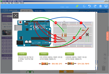 아두이노 프로그램을 블록이나 C언어의 2가지 형태로 작성/편집/업로드까지 하나로 해결할 수 있는 올인원 프로그램이며, 교육사업용 다양한 학습지원 컨텐츠를 제공합니다.