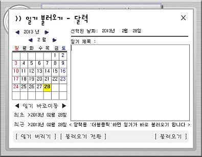 상세정보 일기장 기능 제작사 서버에 일기를 백업하여 언제든지 불러와서 쓸 수 있습니다. 사용자 기능 암호화 기능이 있어 한 프로그램으로 다수의 사용자가 서로에게 방해받지 않고 프로그램을 이용할 수 있습니다.