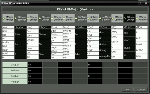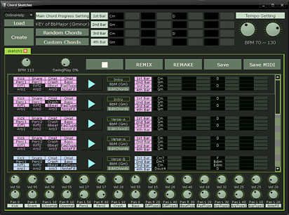 * 랜덤코드진행을 지원하기 때문에 화성학에 익숙하지 않은 일반인도 코드를 설정할 수 있습니다.