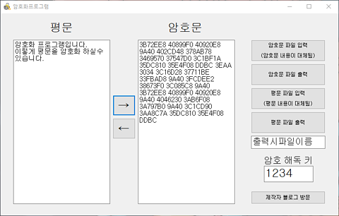 암호 키를 이용해 문장을 암호화 하거나 해독할 수 있습니다. 암호문과 평문 파일을 입출력 할 수 있습니다.