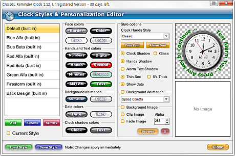 현재 날짜와 시간 확인은 물론 설정된 시간 경과시 메시지 창과 사운드 파일을 재생하는 알람 기능을 이용할 수 있습니다.