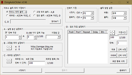 상세정보 빠른 클릭 속도 * 1/100 초까지 지원하는 빠른 클릭 속도를 자랑합니다. 파일 관리 * 파일로 레코딩 및 임의 설정을 저장하여 언제든지 다시 불러 사용 가능합니다. 무설치 * 설치하지 않고 바로 사용 가능합니다. 다양한 기능 * 단순 오토 클릭 기능 뿐 아니라, 레코딩 및 임의 지정 기능을 지원합니다.