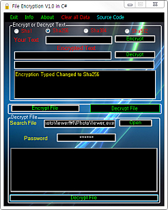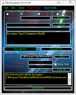상세정보 암호화 기능 파일이나 TEXT를 SHA1, SHA256, SHA384, SHA512의 4가지 방식을 이용하여 암호화하거나 암호 해제할 수 있습니다. 텍스트 암호화 소프트웨어 실행 후 상단영역에서 텍스트를 암호화 하여 설정 또는 암호화 된 텍스트 해제가 가능합니다. 파일 암호화 소프트웨어 하단영역에서는 원하는 파일을 암호화 설정 또는 암호화 된 파일을 해제할 수 있습니다.