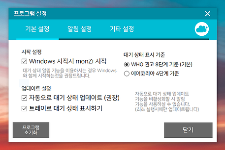 * monZi는 1시간 주기로 갱신되는 환국환경공단의 대기정보 측정값을 실시간으로 받아 대기 상태를 트레이 아이콘의 색상으로 바로 알 수 있도록 해드립니다.