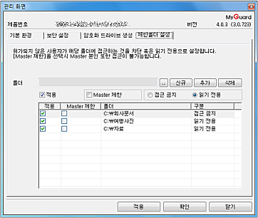 특정 파일이나 폴더를 읽기 전용 또는 접근 금지로 지정이 가능하여 더 안전한 파일 관리가 가능합니다. 그리고 Windows 탐색기와 연동되어 마이가드가 실행중일 때 마우스 우클릭으로 손쉽게 지정이 가능합니다.