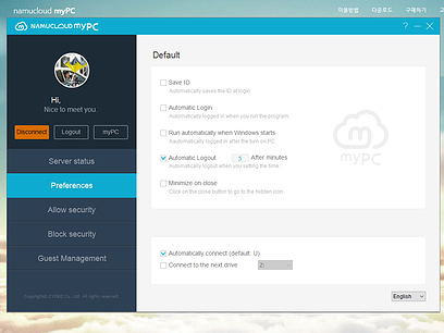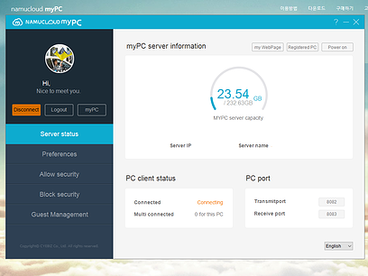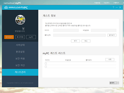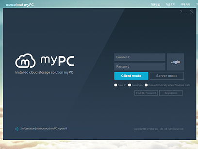* PC에서 namucloud myPC 간편 프로그램(PC용) 설치 후 서버모드 셋팅