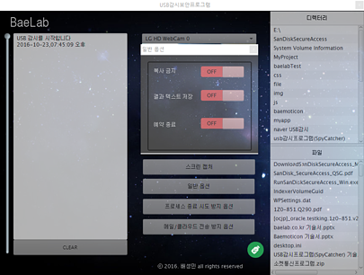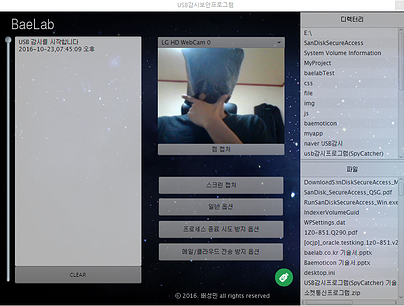 * 프로그램은 백그라운드에서 동작하여 상태표시줄, 작업관리자의 실행중인 프로그램목록에도 나타나지 않습니다. 이점은 아무런 보안 프로그램이 없는 듯한 환경을 보여지게 만들어 USB의 정보를 노리는 스파이가 아무런 의심 없이 접근하도록 하는 미끼가 될 수 있습니다.