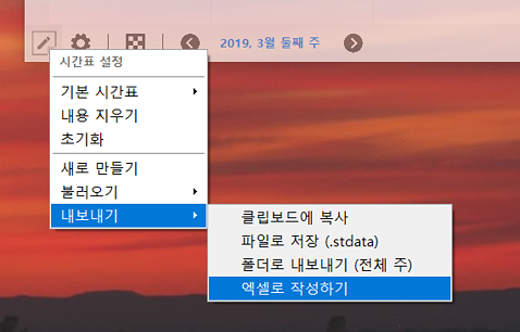 * 쌤테이블은 다른 업무 환경에서도 마저 사용할 수 있도록 모든 주의 시간표를 폴더 안에 내보내어 불러올 수 있습니다. 또한 엑셀에 자동으로 표를 만들어 똑같이 내용을 작성할 수 있는 기능도 탑재되어 만든 시간표를 출력하거나 다른 문서에 첨부하실 수도 있습니다.