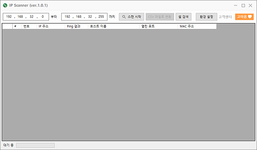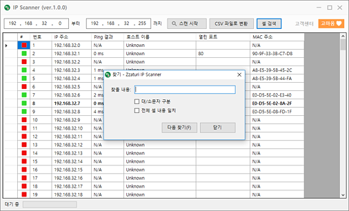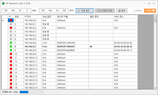 * IP주소, Ping결과, 호스트이름, 포트, MAC 주소 등이 조회됩니다.